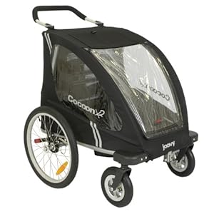 The CocoonX2 is the newest addition to the lineup of Joovy products. The CocoonX2 offers the versatility and flexibility that active families are looking for in great family gear. These days, parents are smart about family purchases and the Joovy CocoonX2 makes incredible sense, plus, it's F-U-N! The CocoonX2 is a stroller-jogger-bicycle trailer all in one! The first time I saw this stroller I knew it was the perfect solution for my family! Simply put, it is the most unique and interesting stroller ever made! Packed with amazing features and made of high quality materials, the CocoonX2 is the wisest investment for our active family. This multi-function stroller easily converts to a jogger and a bike trailer. It simply doesn't get any better! The CocoonX2 has a cocoon-like compartment where my children sit completely content and out of the elements. Entry is through the zippered door that has a cool mesh window for great ventilation and a vinyl window for when the weather is less cooperative. The kids love the two huge windows on either side that allow incredible visibility and views! The interior has two 5-point harnesses and plenty of legroom. Inside, there are two mesh pockets for your children's take-along items. The CocoonX2 has a two position adjustable handlebar to accommodate my husband and me.The CocoonX2's pneumatic swivel front wheels offer super maneuverability. The full size 20" pneumatic rear wheels offer a super smooth ride for your passengers and cargo. To convert the CocoonX2 to a jogger, remove the two swivel front wheels and attach the fixed jogging wheel (sold separately).Parents are raving over the extra-large storage area that has a zipper open/close. There is plenty of room for all of your cargo. The CocoonX2 is 31" wide and accommodates two fifty-pound children – maximum weight is 100 pounds. The single Cocoon will carry one child up to 60 pounds (27" wide). The Cocoon and CocoonX2 fold up compactly and are easy to store.